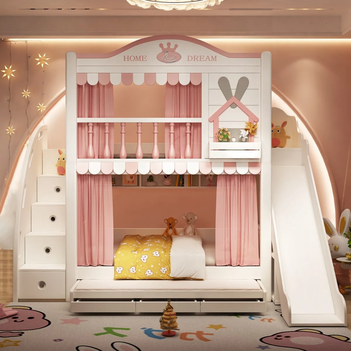 Kids Bunk Bed is a fun and imaginative sleeping solution designed to turn bedtime into an adventure. Featuring a charming princess, castle, or tree house–inspired design, it creates a magical space for both boys and girls. The upper and lower bunk layout is perfect for siblings, sleepovers, or shared bedrooms. Built with a high sleeping platform and reinforced guardrails, it provides enhanced safety and peace of mind for parents. The sturdy construction ensures long-lasting stability for active children. Designed to save space, it leaves more room for play, study, or storage in the bedroom. The elevated design encourages creativity while offering a cozy sleeping environment. Smooth edges and child-friendly materials make it safe for everyday use. Ideal for kids’ rooms, apartments, or family homes, it blends fun with functionality. Easy access to the upper bunk makes climbing safe and simple. This bunk bed supports both comfort and imaginative play. Choose this children’s bunk bed to create a safe, playful, and enchanting bedroom your kids will love.