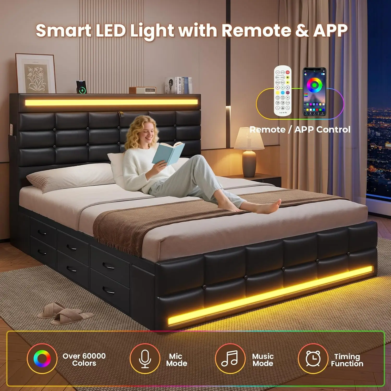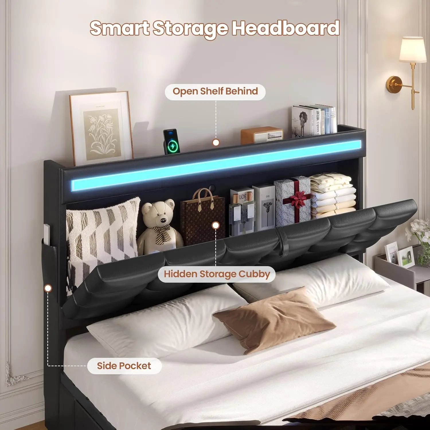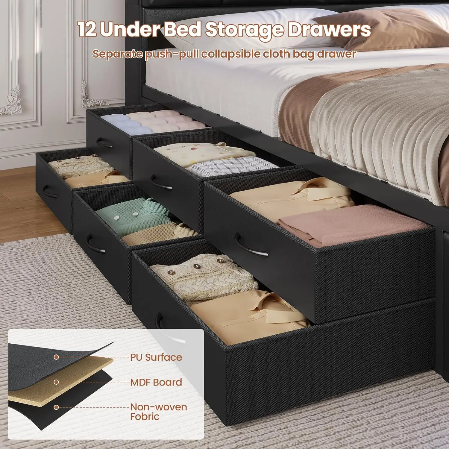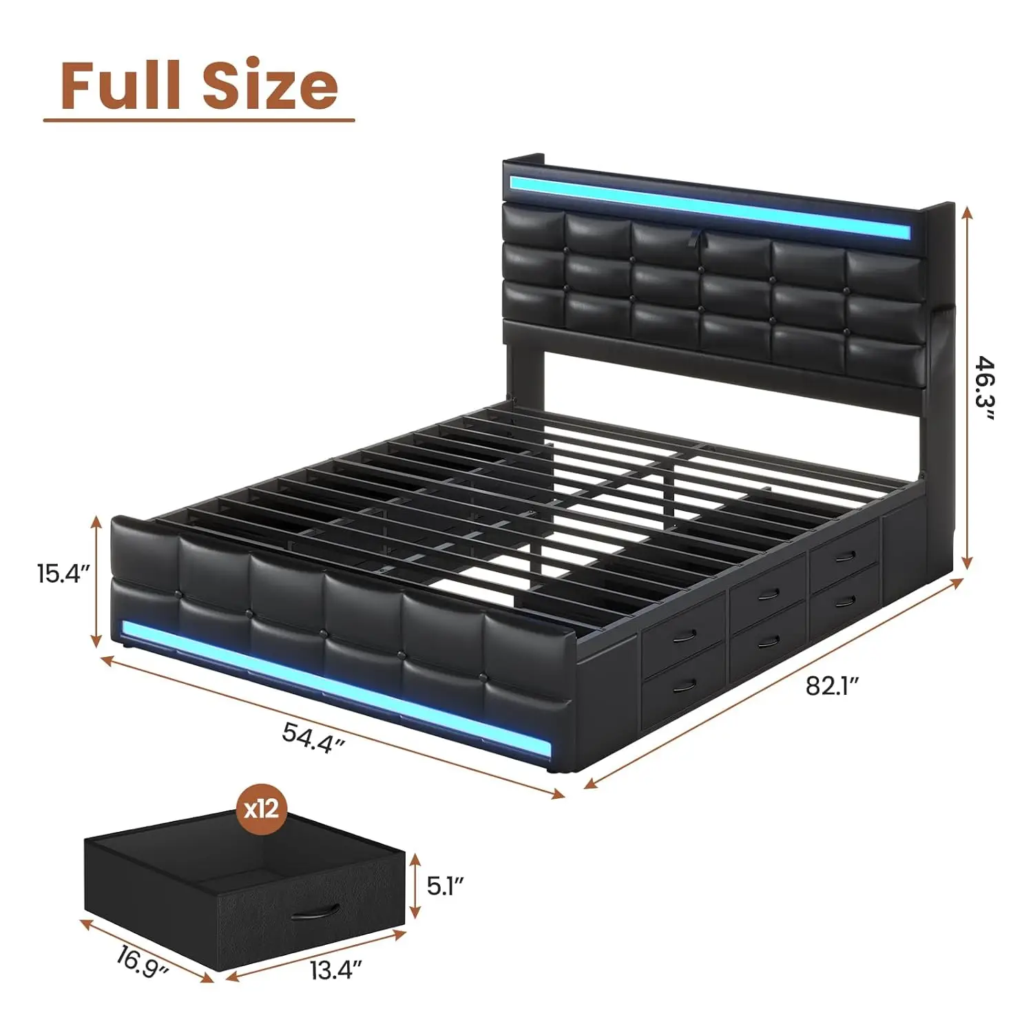 Storage LED Bed is a smart and stylish solution designed to maximize comfort, organization, and functionality in your bedroom. Featuring 12 spacious storage drawers, it provides ample room for clothes, bedding, and everyday essentials. The integrated bookcase storage headboard keeps books, décor, and personal items neatly within reach. Built-in LED lighting adds a modern touch and creates a relaxing ambiance, perfect for nighttime use. The included charging station with USB ports allows you to conveniently power your devices while resting. Designed in a full-size format, this bed frame is ideal for bedrooms, guest rooms, or apartments. The sturdy construction ensures strong mattress support without the need for a box spring. Its customized design blends modern aesthetics with practical storage solutions. Easy-access drawers help keep your space organized and clutter-free. The platform structure promotes airflow and mattress longevity. Perfect for modern lifestyles, it combines comfort, technology, and storage in one elegant piece. Choose this full-size bed frame for smart design, organized living, and enhanced bedroom convenience.